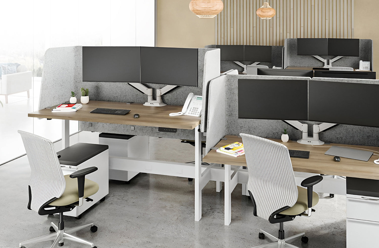One standout upgrade was the introduction of Uplifting dual monitor arms (model #62457-7000-500-8408). This addition allowed employees to seamlessly transition between workstations, ensuring efficiency for those using dual monitors daily.